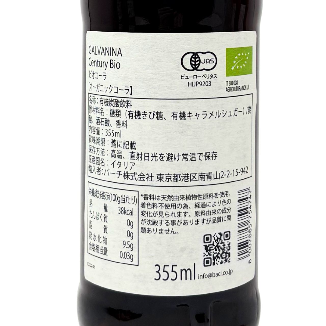 微炭酸・ノンカフェイン・植物性 100%のオーガニックコーラです。炭酸はシエナの地下から採掘した天然炭酸を使用。口に含むと、絶妙に配合されたオーガニックスパイスがほんのり香る優しいコーラです。